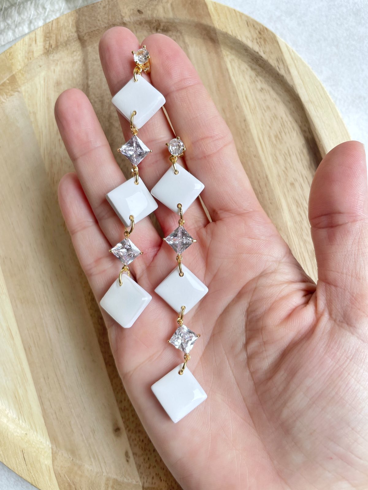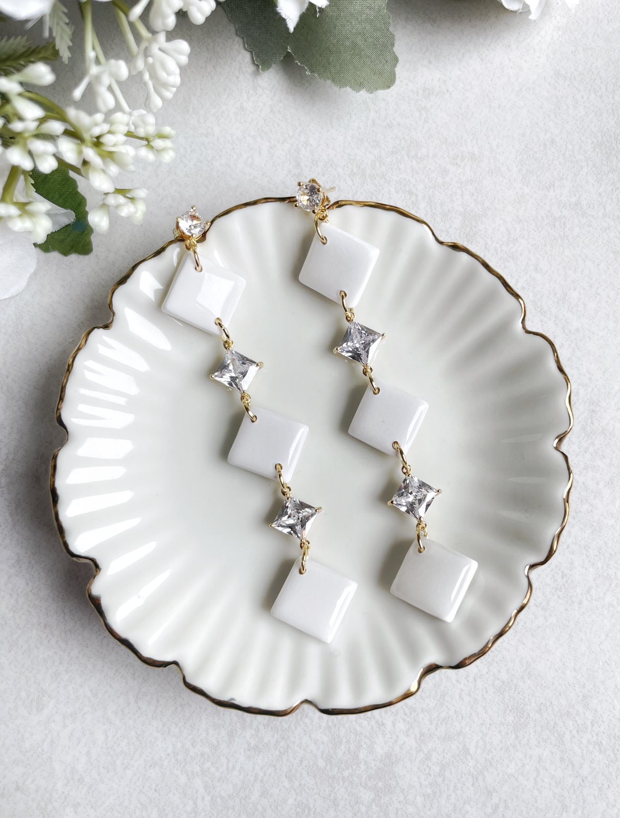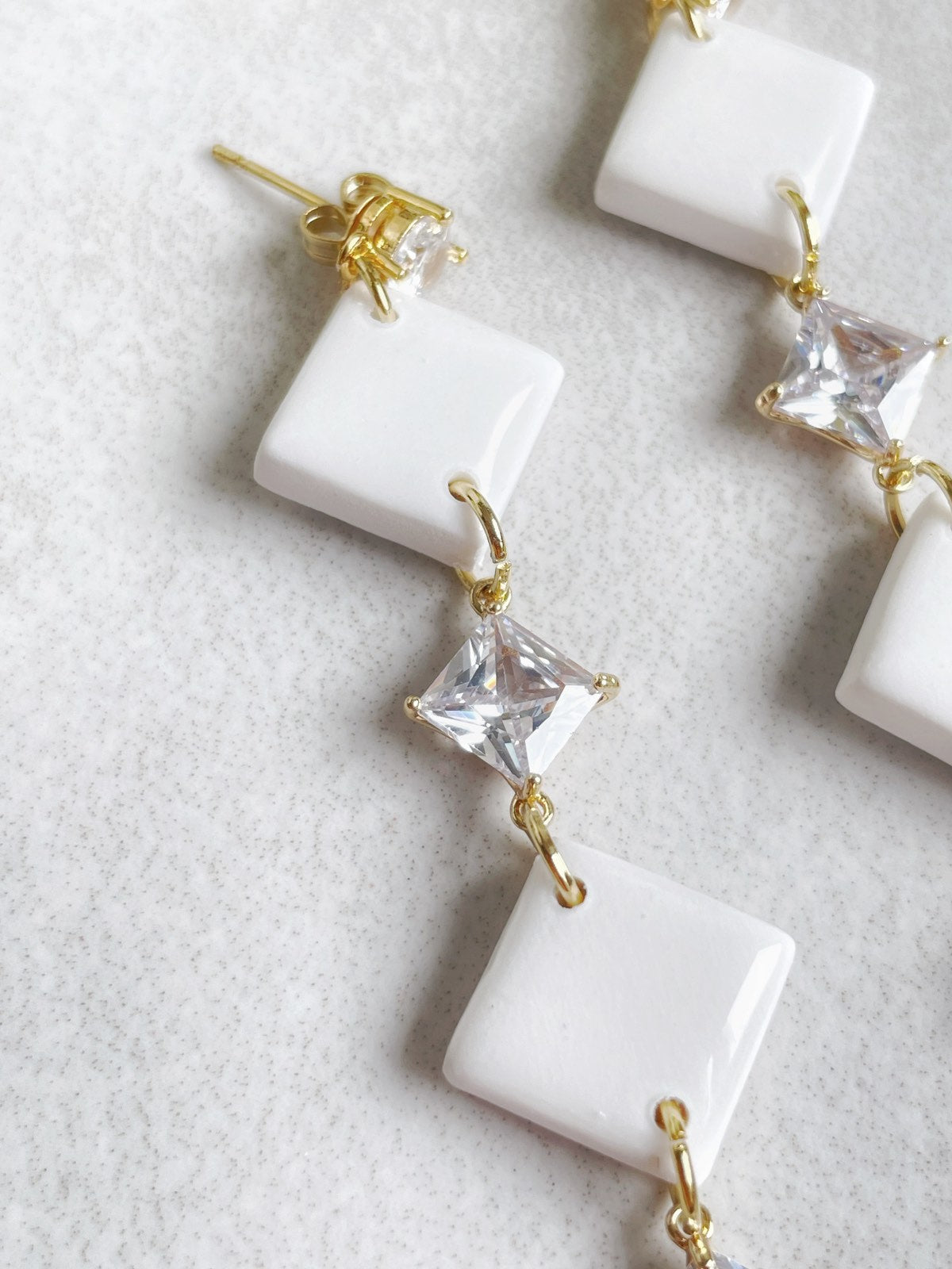 Náušnice Madeline sú stelesnením čistej elegancie a ženskosti. Ich prepracovaný dizajn spája jemný lesk bielych štvorcov s iskrivým odleskom krištáľových kamienkov, ktoré krásne zachytávajú svetlo pri každom pohybe.