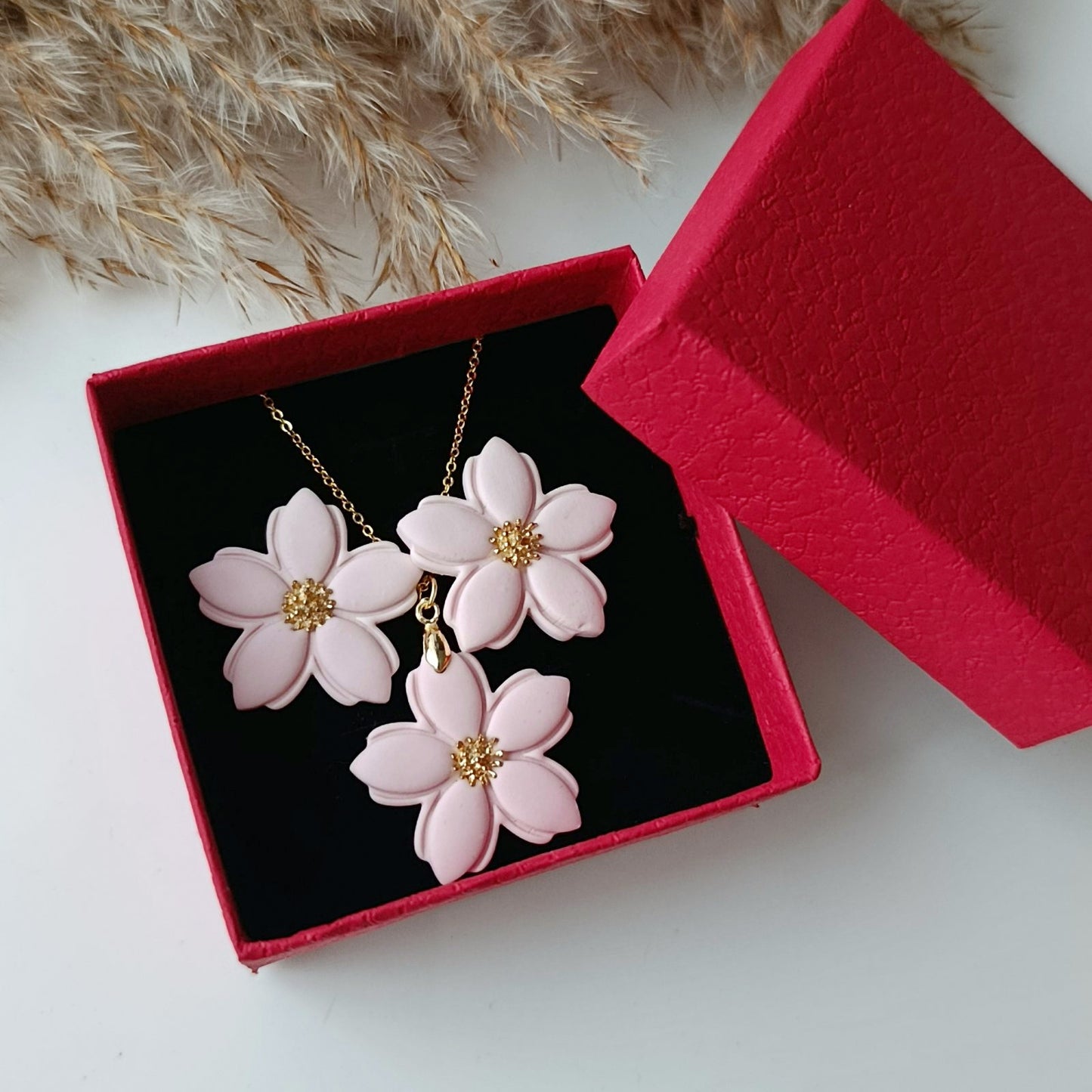 Floria set je ručne vyrobený z polymérovej hmoty, pozlátenými komponentami s dôrazom na ľahkosť, pohodlie a precízne spracovanie.