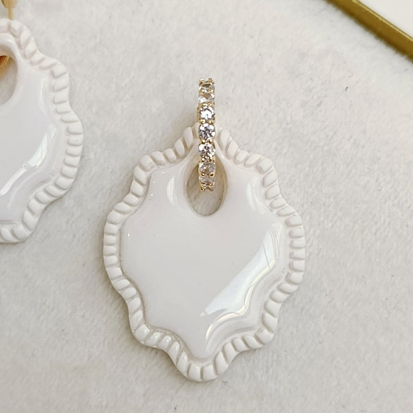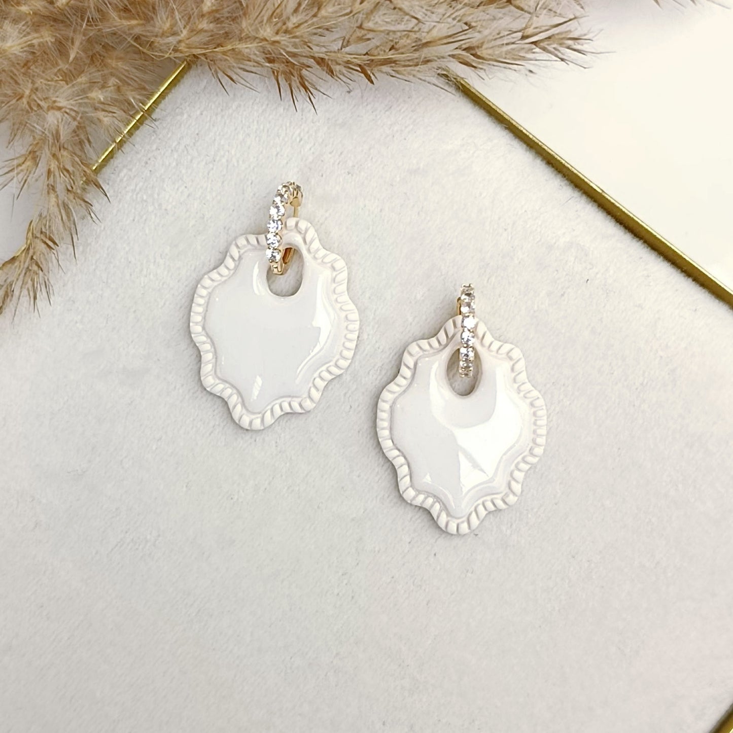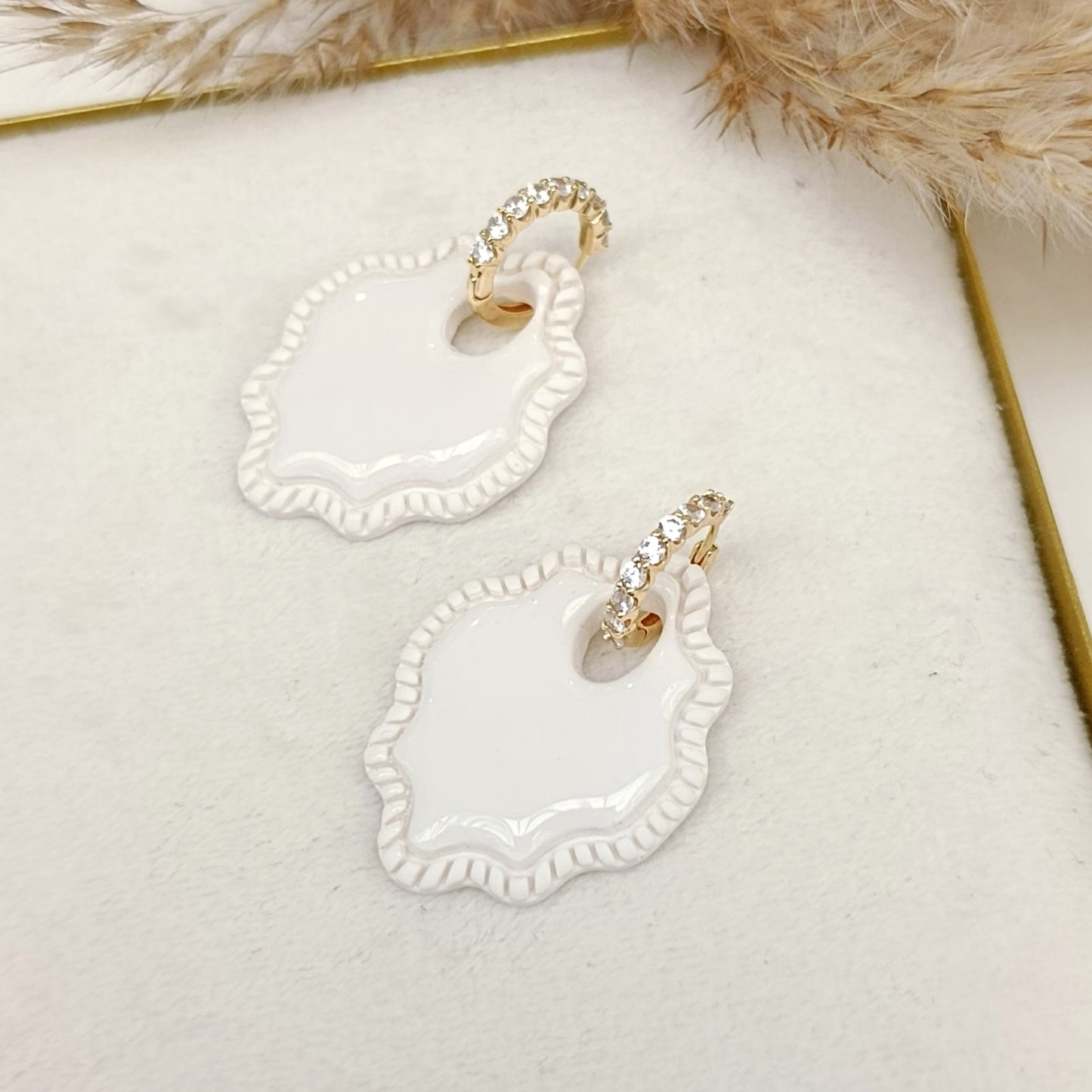 Svadobné náušnice Aurielle zaujmú jemným ornamentálnym tvarom a elegantným leskom. Svetlý reliéfny dizajn so živicou v kombinácii so zirkónovým, 18 karatovým pozláteným komponentom vytvára harmonický a nadčasový šperk, ktorý krásne doplní svadobný styling nevesty. Kruhový šperk sa dá dať dole a nosiť osobitne :)