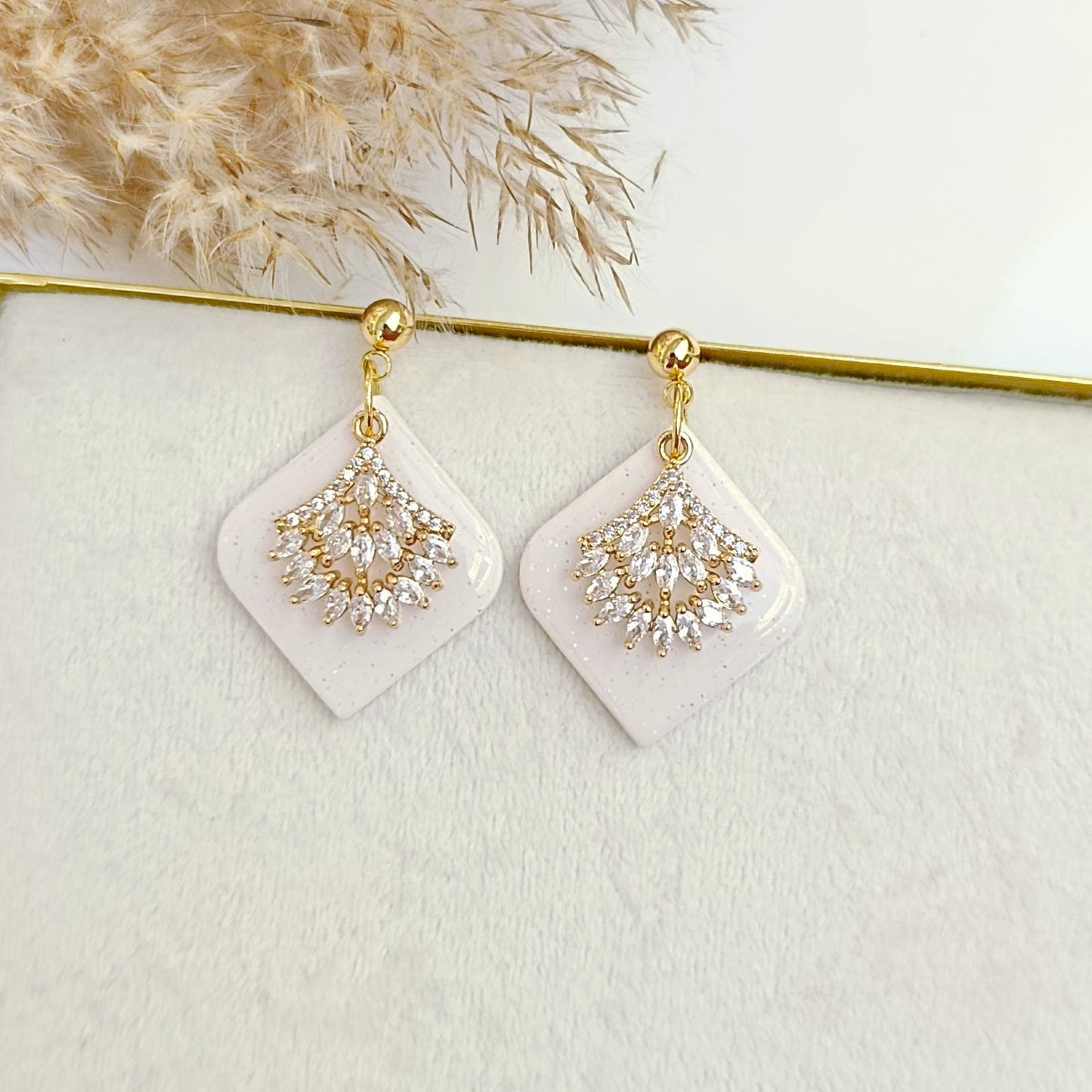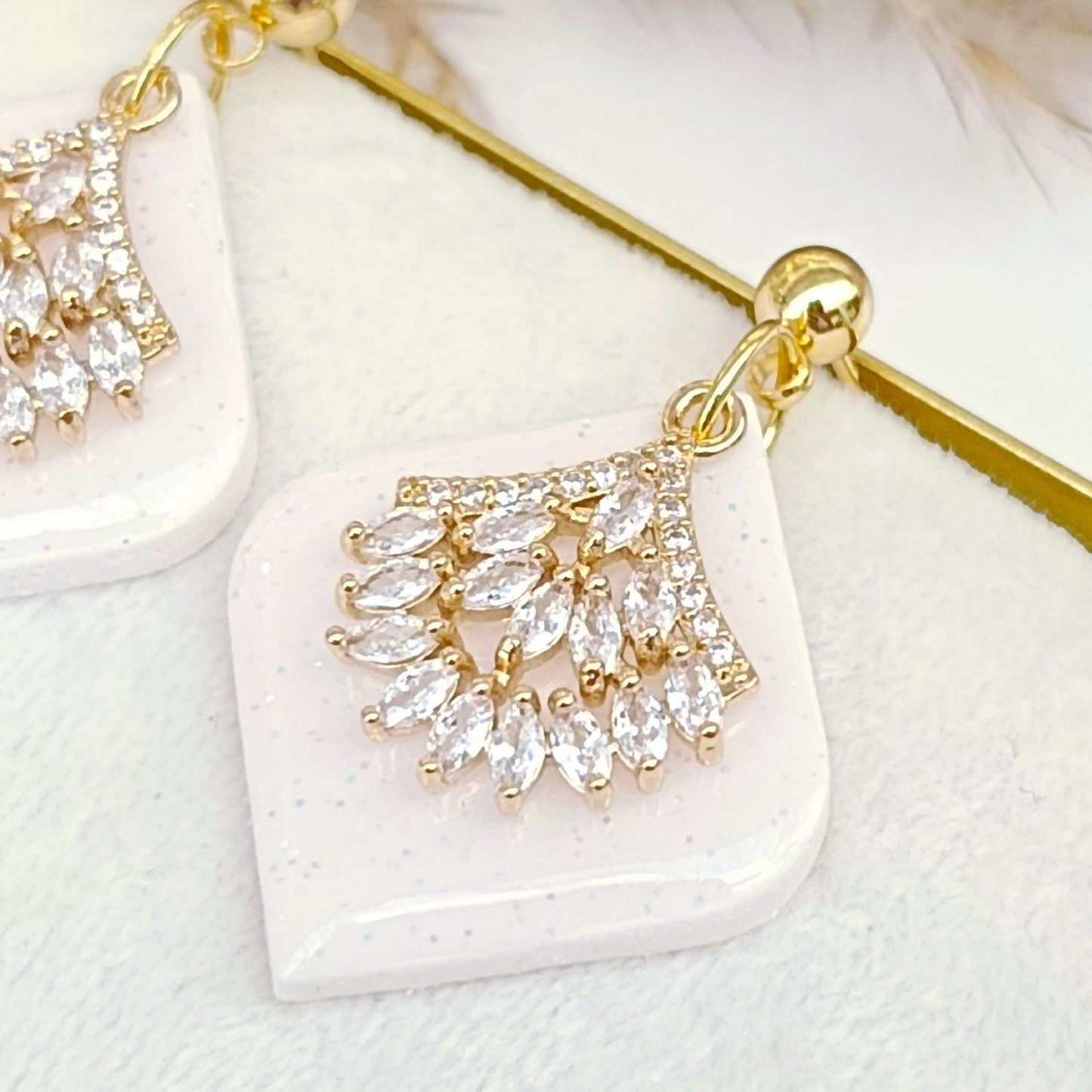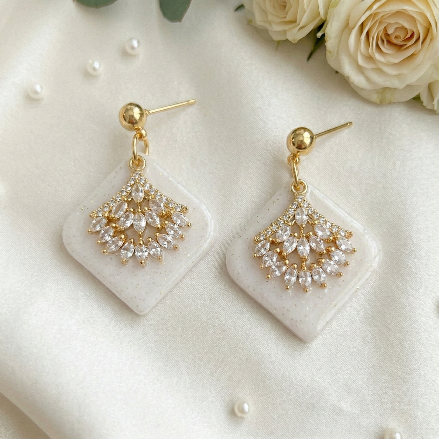 Vďaka ľahkému polymérovému materiálu sú náušnice pohodlné aj počas celého svadobného dňa. Pozlátené komponenty podčiarkujú ich slávnostný vzhľad a dodávajú modelu elegantný šperkový efekt.