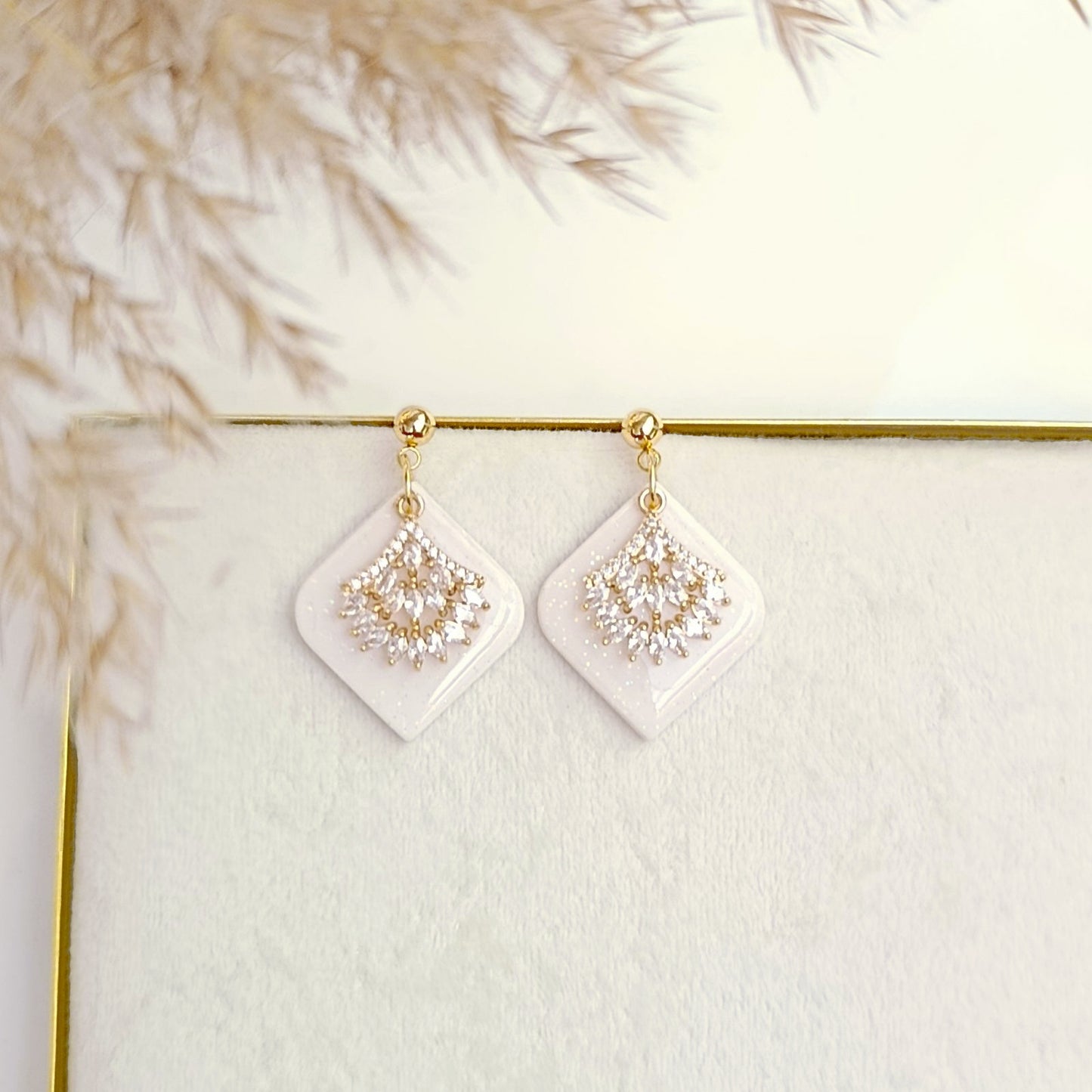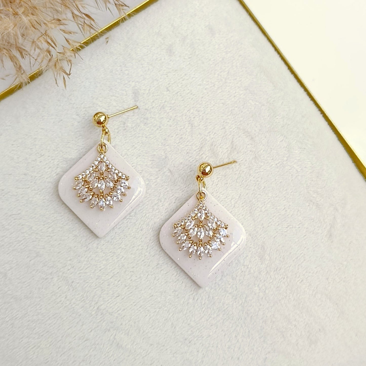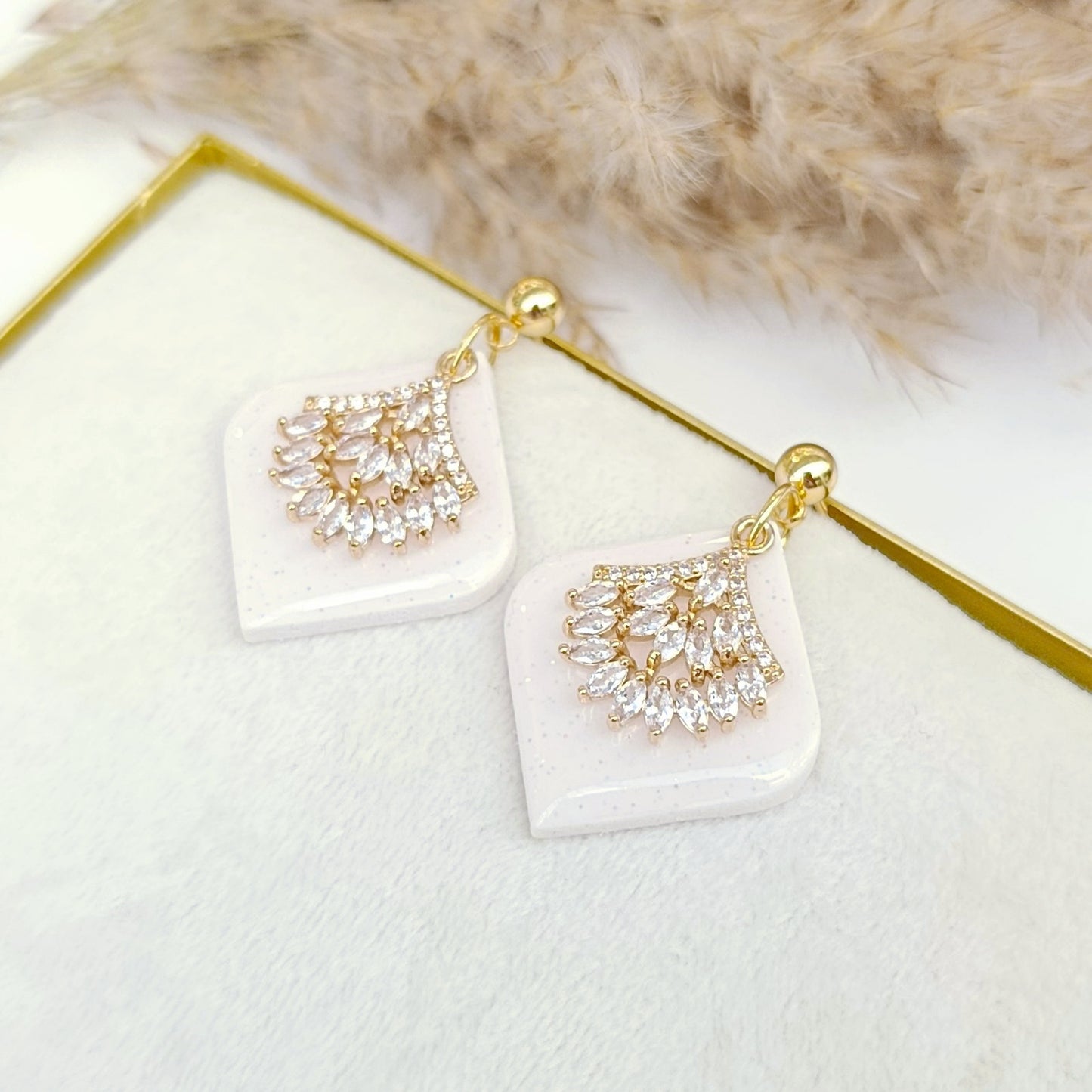 Svadobné náušnice Serena sú stelesnením jemnej elegancie a nadčasovej krásy. Minimalistická štvorcová silueta v svetlom odtieni vytvára čistý základ, ktorý dopĺňa výrazný zirkónový detail v pozlátenom osadení.