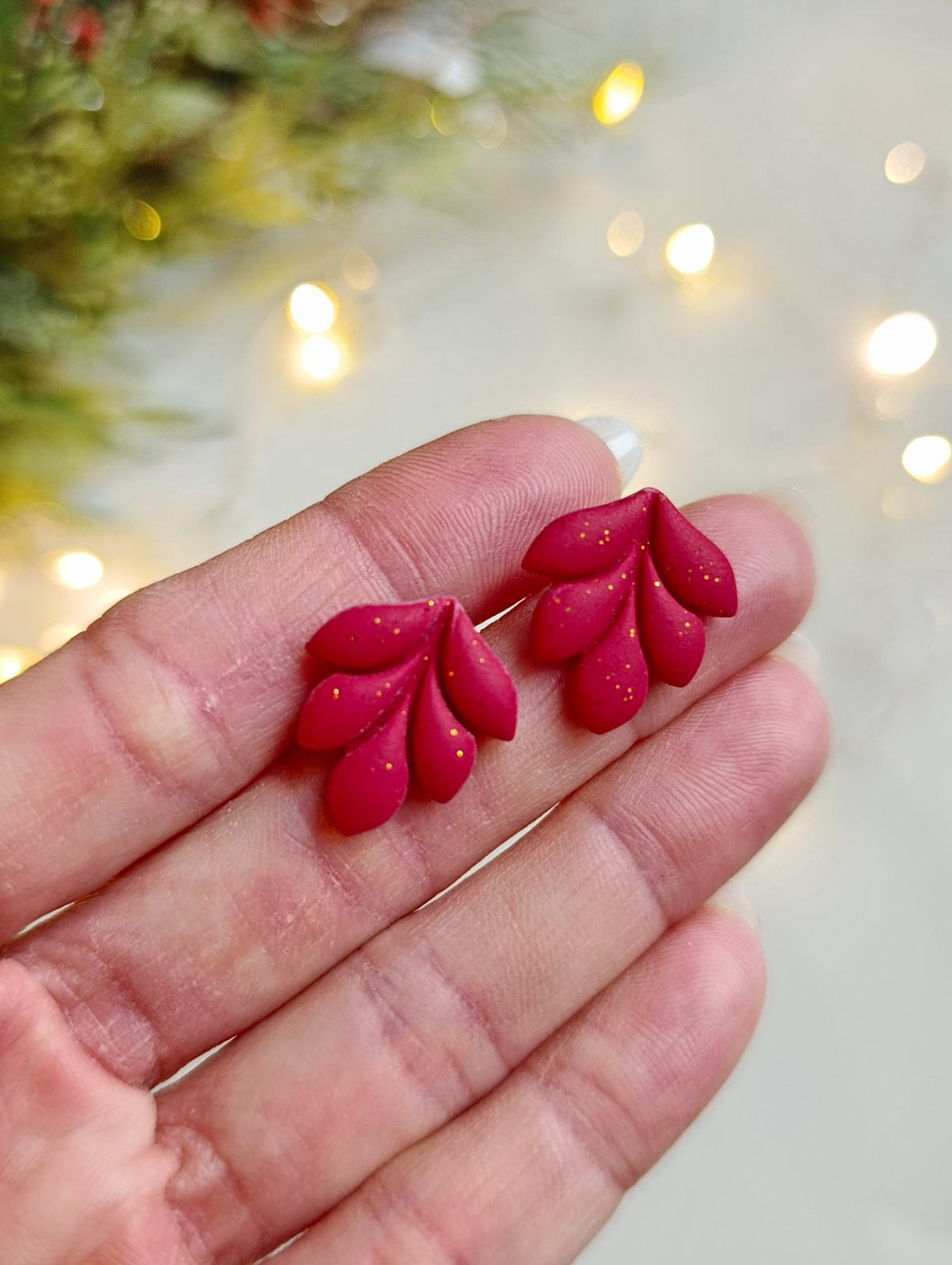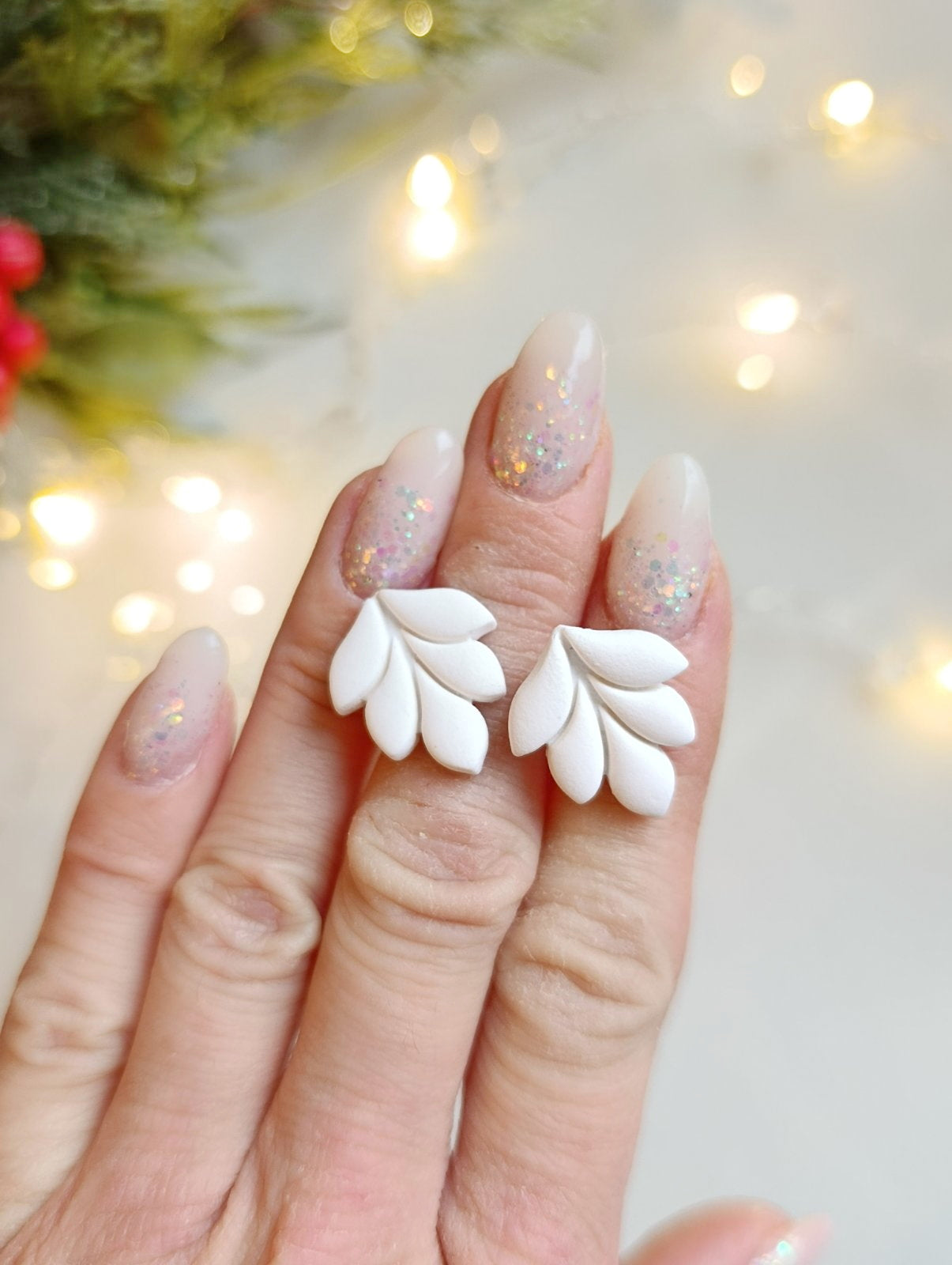 Motív drobných lístkov vytvára na uchu elegantný efekt. Náušnice sú z polymérovej hmoty s jemnými zlatými glitrami, povrch je matný, ale pri bližšom pohľade sa decentne trblieta.